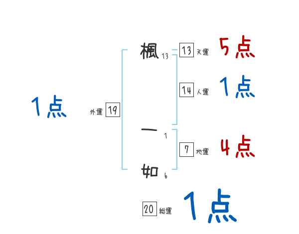 地運![]() | 楓一如さんの地運は7画の4つ星!強い意志や信念を持ち独立心が強い。自立する。 個性を表す基礎的な運勢です。性格形成や対人関係、行動力など家庭環境に影響されます。主に誕生してから20歳くらいまでの若年期の運勢を表します。 |