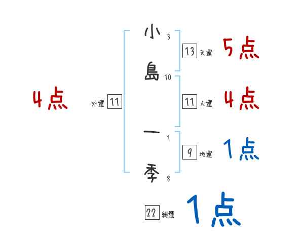 天運![]() | 小島一季さんの天運は13画の5つ星!才能に恵まれ人気がある。名声を手に入れる。円満な人生。 家系が持つ宿命的な運勢を表します。祖先から受け継いだ苗字ですので自分の力が及びません。家柄を象徴します。 |
