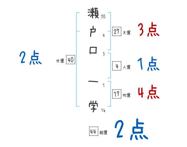 総運![]() | 瀬戸口一学さんの総運は44画の2つ星!誠実で慎重な性格。物事を考えすぎないように注意しましょう。 あなたの人生を表す1番重要な運勢です。生涯を通じて影響する総合運となり、主に50歳以降の晩年期に影響を及ぼします。 |