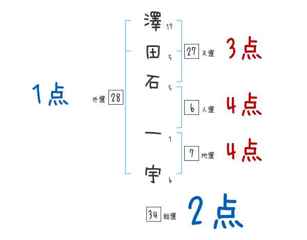 総運![]() | 澤田石一宇さんの総運は34画の2つ星!独創性に優れるが、自尊心が強く災難に注意しましょう。 あなたの人生を表す1番重要な運勢です。生涯を通じて影響する総合運となり、主に50歳以降の晩年期に影響を及ぼします。 |