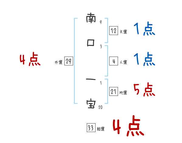 人運![]() | 南口一宝さんの人運は4画の1つ星!感情が不安定で苦労するかも。周囲との協調を心掛けましょう。 性格や才能などを表す2番目に重要な運勢です。人間関係や協調性、社会的な成功に影響します。主に20歳から50歳ぐらいまでの中年期の運勢を表します。 |