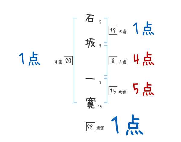 総運![]() | 石坂一寛さんの総運は28画の1つ星!家庭環境に注意。スポーツで活躍できる能力があるかも。 あなたの人生を表す1番重要な運勢です。生涯を通じて影響する総合運となり、主に50歳以降の晩年期に影響を及ぼします。 |