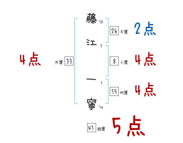 外運![]() | 藤江一寧さんの外運は33画の4つ星!権力志向でプライドが高い。勇気があり運を切り開き成功する。 生活面を象徴する運勢です。外部から受ける影響力を表し、結婚運、家庭運や職場、環境への順応性を表します。 |