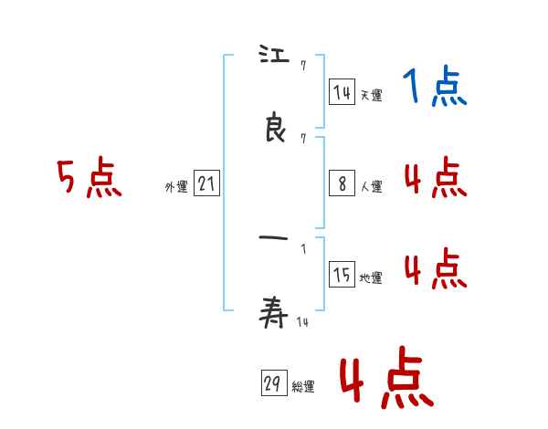 外運![]() | 江良一寿さんの外運は21画の5つ星!統率力がある。独立し成功する。名誉を手に入れる。 生活面を象徴する運勢です。外部から受ける影響力を表し、結婚運、家庭運や職場、環境への順応性を表します。 |