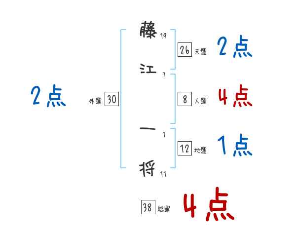 天運![]() | 藤江一将さんの天運は26画の2つ星!波瀾万丈かも。信頼できる人を大事にしましょう。 家系が持つ宿命的な運勢を表します。祖先から受け継いだ苗字ですので自分の力が及びません。家柄を象徴します。 |