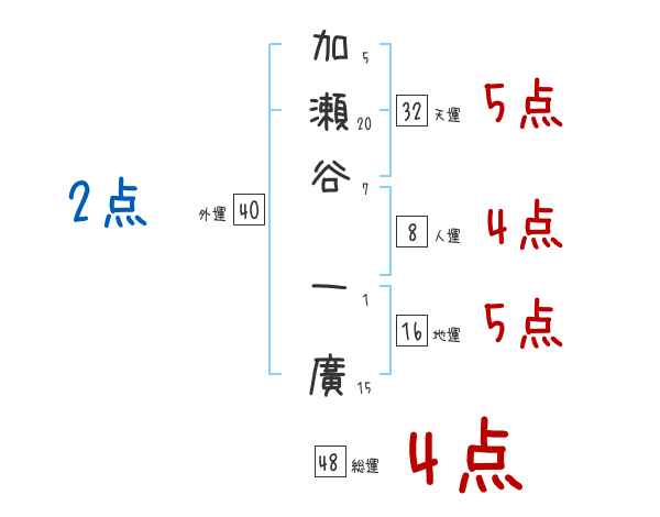 天運![]() | 加瀬谷一廣さんの天運は32画の5つ星!柔軟性があり成功する。チャンスが多く金運が良い。 家系が持つ宿命的な運勢を表します。祖先から受け継いだ苗字ですので自分の力が及びません。家柄を象徴します。 |