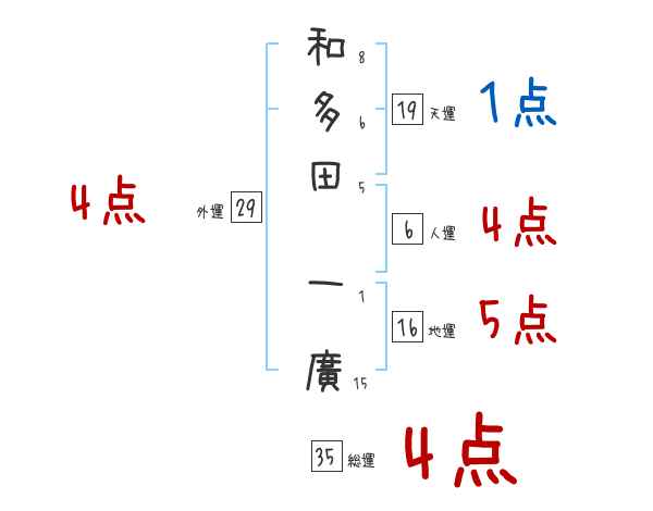 総運![]() | 和多田一廣さんの総運は35画の4つ星!温厚な性格で感受性が高い。穏和な性格で人望が厚い。 あなたの人生を表す1番重要な運勢です。生涯を通じて影響する総合運となり、主に50歳以降の晩年期に影響を及ぼします。 |