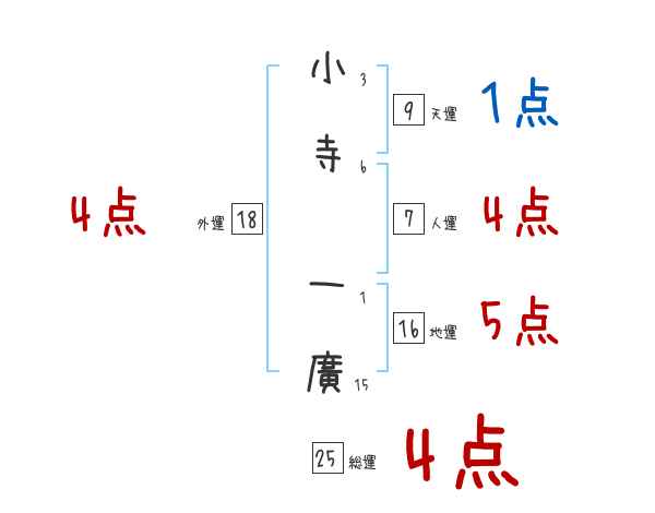 地運![]() | 小寺一廣さんの地運は16画の5つ星!人望が厚く大きく発展する。逆転成功が見える。 個性を表す基礎的な運勢です。性格形成や対人関係、行動力など家庭環境に影響されます。主に誕生してから20歳くらいまでの若年期の運勢を表します。 |