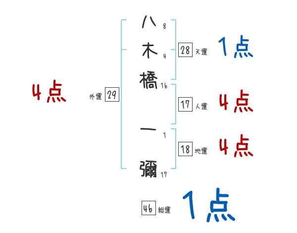 天運![]() | 八木橋一彌さんの天運は28画の1つ星!家庭環境に注意。スポーツで活躍できる能力があるかも。 家系が持つ宿命的な運勢を表します。祖先から受け継いだ苗字ですので自分の力が及びません。家柄を象徴します。 |