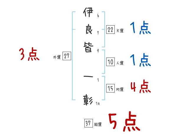 総運![]() | 伊良皆一彰さんの総運は37画の5つ星!努力家で順応性に優れる。現実的な考え方ができ忠実に物事をこなす。 あなたの人生を表す1番重要な運勢です。生涯を通じて影響する総合運となり、主に50歳以降の晩年期に影響を及ぼします。 |
