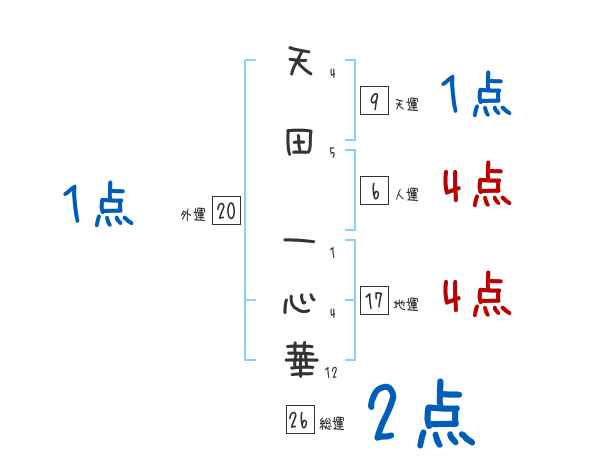 天運![]() | 天田一心華さんの天運は9画の1つ星!消極的で才能を発揮することが苦手なことも。周りの意見に耳を傾けましょう。 家系が持つ宿命的な運勢を表します。祖先から受け継いだ苗字ですので自分の力が及びません。家柄を象徴します。 |
