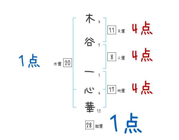 天運![]() | 木谷一心華さんの天運は11画の4つ星!着実に富や地位を得る幸運な人生。 家系が持つ宿命的な運勢を表します。祖先から受け継いだ苗字ですので自分の力が及びません。家柄を象徴します。 |