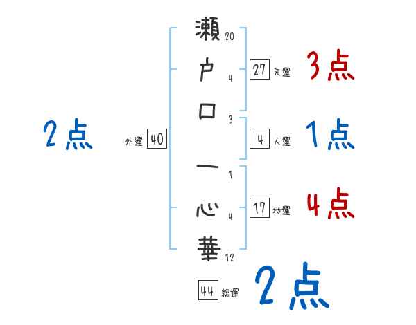 総運![]() | 瀬戸口一心華さんの総運は44画の2つ星!誠実で慎重な性格。物事を考えすぎないように注意しましょう。 あなたの人生を表す1番重要な運勢です。生涯を通じて影響する総合運となり、主に50歳以降の晩年期に影響を及ぼします。 |