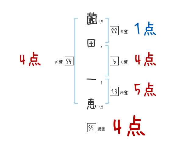 外運![]() | 薗田一恵さんの外運は29画の4つ星!完全主義で才能がある。厳格な心の持ち主。 生活面を象徴する運勢です。外部から受ける影響力を表し、結婚運、家庭運や職場、環境への順応性を表します。 |