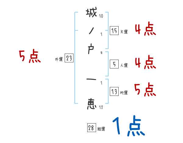 天運![]() | 城ノ戸一恵さんの天運は15画の4つ星!人徳があり出世する。順調に物事を進め円満な人生。 家系が持つ宿命的な運勢を表します。祖先から受け継いだ苗字ですので自分の力が及びません。家柄を象徴します。 |