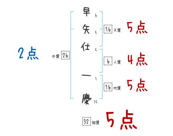 総運![]() | 早矢仕一慶さんの総運は32画の5つ星!柔軟性があり成功する。チャンスが多く金運が良い。 あなたの人生を表す1番重要な運勢です。生涯を通じて影響する総合運となり、主に50歳以降の晩年期に影響を及ぼします。 |