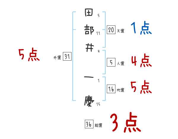 総運![]() | 田部井一慶さんの総運は36画の3つ星!先見性が豊かです。多少神経質で苦労することも。 あなたの人生を表す1番重要な運勢です。生涯を通じて影響する総合運となり、主に50歳以降の晩年期に影響を及ぼします。 |