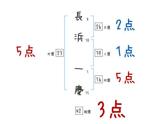 外運![]() | 長浜一慶さんの外運は23画の5つ星!想像力に優れ活力がある。一代で成功し名誉を手に入れる。 生活面を象徴する運勢です。外部から受ける影響力を表し、結婚運、家庭運や職場、環境への順応性を表します。 |