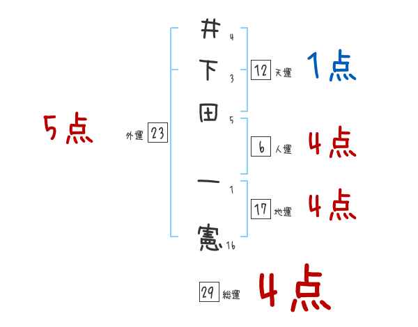 総運![]() | 井下田一憲さんの総運は29画の4つ星!完全主義で才能がある。厳格な心の持ち主。 あなたの人生を表す1番重要な運勢です。生涯を通じて影響する総合運となり、主に50歳以降の晩年期に影響を及ぼします。 |