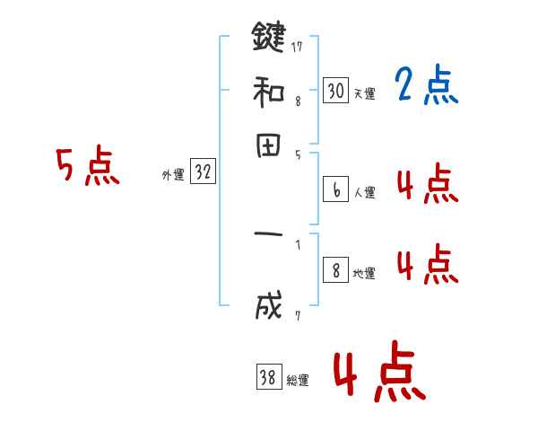 外運![]() | 鍵和田一成さんの外運は32画の5つ星!柔軟性があり成功する。チャンスが多く金運が良い。 生活面を象徴する運勢です。外部から受ける影響力を表し、結婚運、家庭運や職場、環境への順応性を表します。 |