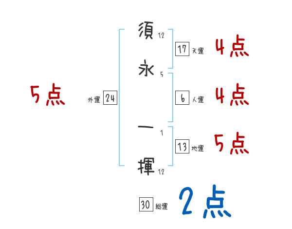天運![]() | 須永一揮さんの天運は17画の4つ星!積極的な行動力。地位を気づき財産を手に入れる。純粋な心と直感力。 家系が持つ宿命的な運勢を表します。祖先から受け継いだ苗字ですので自分の力が及びません。家柄を象徴します。 |