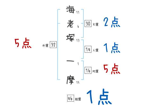 外運![]() | 海老塚一摩さんの外運は32画の5つ星!柔軟性があり成功する。チャンスが多く金運が良い。 生活面を象徴する運勢です。外部から受ける影響力を表し、結婚運、家庭運や職場、環境への順応性を表します。 |