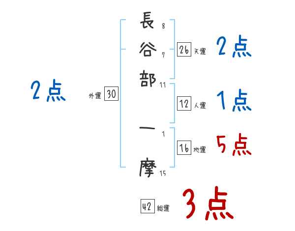 天運![]() | 長谷部一摩さんの天運は26画の2つ星!波瀾万丈かも。信頼できる人を大事にしましょう。 家系が持つ宿命的な運勢を表します。祖先から受け継いだ苗字ですので自分の力が及びません。家柄を象徴します。 |