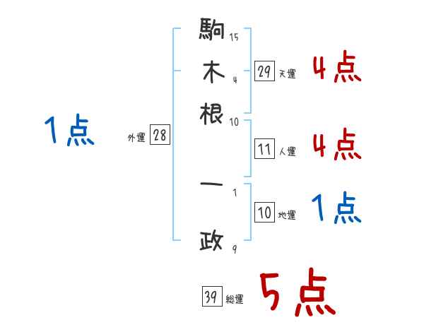 総運![]() | 駒木根一政さんの総運は39画の5つ星!社交性に優れ人望が厚い。人の上に立ち成功する。 あなたの人生を表す1番重要な運勢です。生涯を通じて影響する総合運となり、主に50歳以降の晩年期に影響を及ぼします。 |