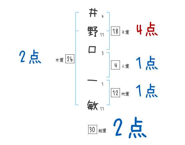 天運![]() | 井野口一敏さんの天運は18画の4つ星!情熱的で剛気。忍耐力があり信頼される。 家系が持つ宿命的な運勢を表します。祖先から受け継いだ苗字ですので自分の力が及びません。家柄を象徴します。 |