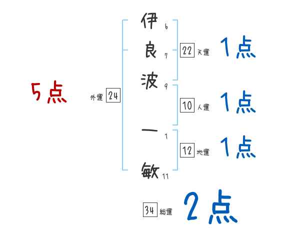 外運![]() | 伊良波一敏さんの外運は24画の5つ星!家庭運が良く順調な人生。金運にも恵まれる。 生活面を象徴する運勢です。外部から受ける影響力を表し、結婚運、家庭運や職場、環境への順応性を表します。 |