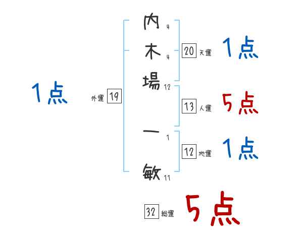 外運![]() | 内木場一敏さんの外運は19画の1つ星!優れた才能を持ちますが、協調性が足りないことも。周りの人と協力する事を意識しましょう。 生活面を象徴する運勢です。外部から受ける影響力を表し、結婚運、家庭運や職場、環境への順応性を表します。 |