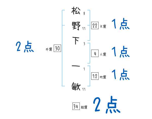 総運![]() | 松野下一敏さんの総運は34画の2つ星!独創性に優れるが、自尊心が強く災難に注意しましょう。 あなたの人生を表す1番重要な運勢です。生涯を通じて影響する総合運となり、主に50歳以降の晩年期に影響を及ぼします。 |