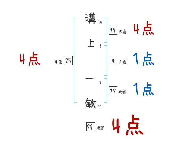 総運![]() | 溝上一敏さんの総運は29画の4つ星!完全主義で才能がある。厳格な心の持ち主。 あなたの人生を表す1番重要な運勢です。生涯を通じて影響する総合運となり、主に50歳以降の晩年期に影響を及ぼします。 |