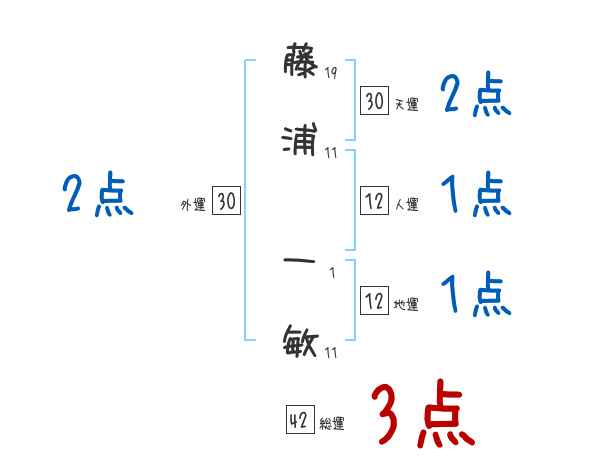 天運![]() | 藤浦一敏さんの天運は30画の2つ星!浮き沈みの激しさに注意しましょう。 家系が持つ宿命的な運勢を表します。祖先から受け継いだ苗字ですので自分の力が及びません。家柄を象徴します。 |