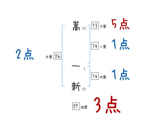 外運![]() | 嵩一新さんの外運は26画の2つ星!波瀾万丈かも。信頼できる人を大事にしましょう。 生活面を象徴する運勢です。外部から受ける影響力を表し、結婚運、家庭運や職場、環境への順応性を表します。 |