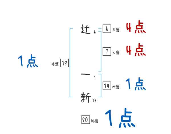 天運![]() | 辻一新さんの天運は6画の4つ星!慎重な努力家で信頼を得る。誠実な精神で向上心に優れる。 家系が持つ宿命的な運勢を表します。祖先から受け継いだ苗字ですので自分の力が及びません。家柄を象徴します。 |