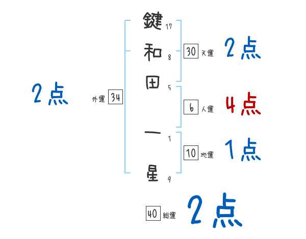 天運![]() | 鍵和田一星さんの天運は30画の2つ星!浮き沈みの激しさに注意しましょう。 家系が持つ宿命的な運勢を表します。祖先から受け継いだ苗字ですので自分の力が及びません。家柄を象徴します。 |