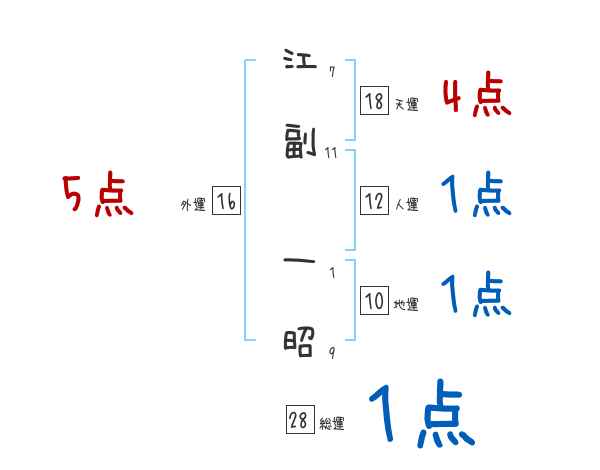 総運![]() | 江副一昭さんの総運は28画の1つ星!家庭環境に注意。スポーツで活躍できる能力があるかも。 あなたの人生を表す1番重要な運勢です。生涯を通じて影響する総合運となり、主に50歳以降の晩年期に影響を及ぼします。 |