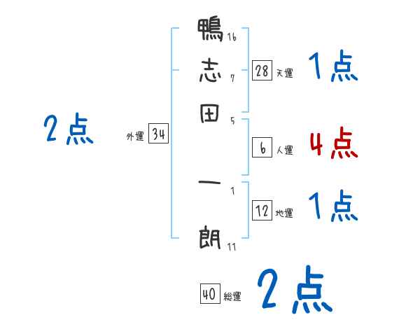 天運![]() | 鴨志田一朗さんの天運は28画の1つ星!家庭環境に注意。スポーツで活躍できる能力があるかも。 家系が持つ宿命的な運勢を表します。祖先から受け継いだ苗字ですので自分の力が及びません。家柄を象徴します。 |