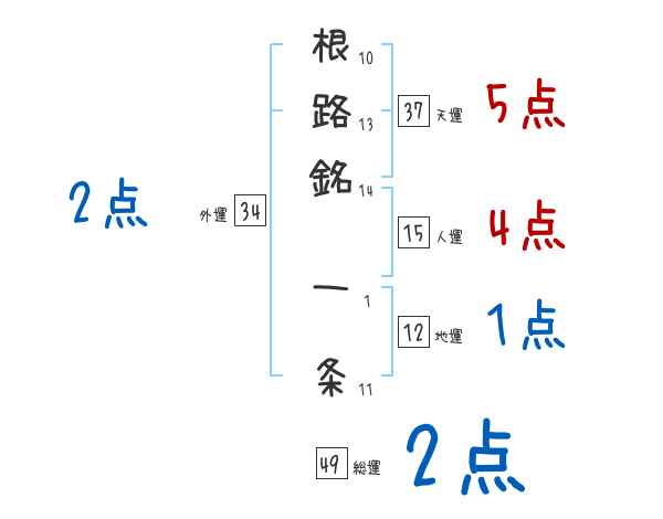 総運![]() | 根路銘一条さんの総運は49画の2つ星!不安定な性格で明暗がある人生。周りの人には支援されやすい。 あなたの人生を表す1番重要な運勢です。生涯を通じて影響する総合運となり、主に50歳以降の晩年期に影響を及ぼします。 |
