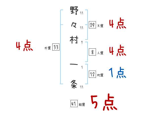 外運![]() | 野々村一条さんの外運は33画の4つ星!権力志向でプライドが高い。勇気があり運を切り開き成功する。 生活面を象徴する運勢です。外部から受ける影響力を表し、結婚運、家庭運や職場、環境への順応性を表します。 |