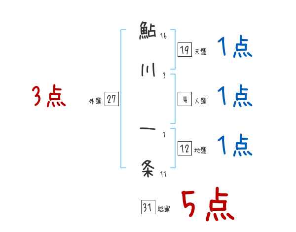 天運![]() | 鮎川一条さんの天運は19画の1つ星!優れた才能を持ちますが、協調性が足りないことも。周りの人と協力する事を意識しましょう。 家系が持つ宿命的な運勢を表します。祖先から受け継いだ苗字ですので自分の力が及びません。家柄を象徴します。 |