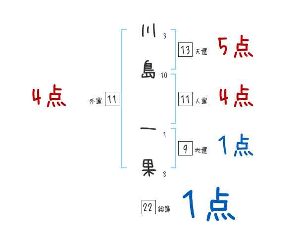 天運![]() | 川島一果さんの天運は13画の5つ星!才能に恵まれ人気がある。名声を手に入れる。円満な人生。 家系が持つ宿命的な運勢を表します。祖先から受け継いだ苗字ですので自分の力が及びません。家柄を象徴します。 |
