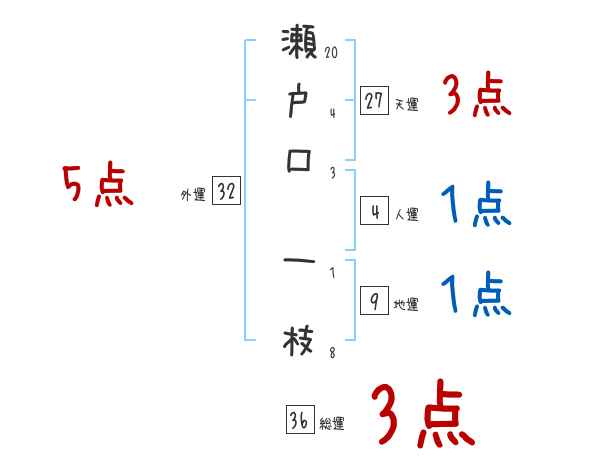 外運![]() | 瀬戸口一枝さんの外運は32画の5つ星!柔軟性があり成功する。チャンスが多く金運が良い。 生活面を象徴する運勢です。外部から受ける影響力を表し、結婚運、家庭運や職場、環境への順応性を表します。 |
