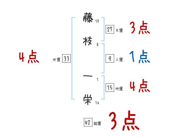 | 外運  | 藤枝一栄さんの外運は33画の4つ星!権力志向でプライドが高い。勇気があり運を切り開き成功する。生活面を象徴する運勢です。外部から受ける影響力を表し、結婚運、家庭運や職場、環境への順応性を表します。 |