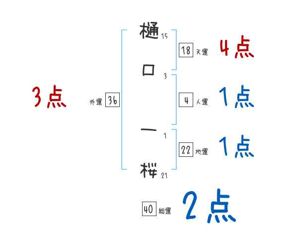 天運![]() | 樋口一桜さんの天運は18画の4つ星!情熱的で剛気。忍耐力があり信頼される。 家系が持つ宿命的な運勢を表します。祖先から受け継いだ苗字ですので自分の力が及びません。家柄を象徴します。 |