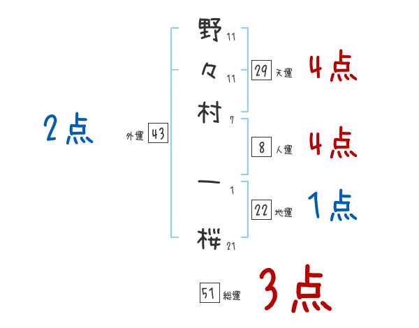 総運![]() | 野々村一桜さんの総運は51画の3つ星!変化が激しく、危険に注意。堅実な性格。 あなたの人生を表す1番重要な運勢です。生涯を通じて影響する総合運となり、主に50歳以降の晩年期に影響を及ぼします。 |