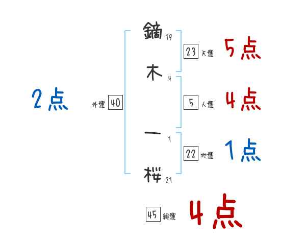 天運![]() | 鏑木一桜さんの天運は23画の5つ星!想像力に優れ活力がある。一代で成功し名誉を手に入れる。 家系が持つ宿命的な運勢を表します。祖先から受け継いだ苗字ですので自分の力が及びません。家柄を象徴します。 |