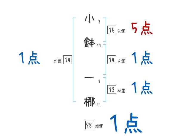 総運![]() | 小鉢一梛さんの総運は28画の1つ星!家庭環境に注意。スポーツで活躍できる能力があるかも。 あなたの人生を表す1番重要な運勢です。生涯を通じて影響する総合運となり、主に50歳以降の晩年期に影響を及ぼします。 |
