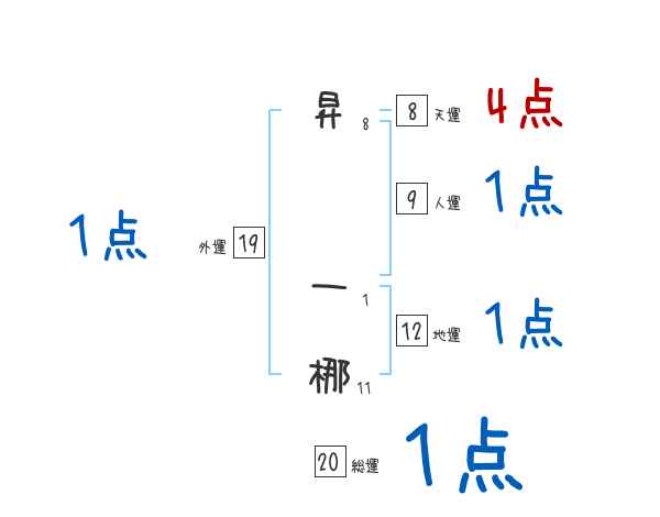 外運![]() | 昇一梛さんの外運は19画の1つ星!優れた才能を持ちますが、協調性が足りないことも。周りの人と協力する事を意識しましょう。 生活面を象徴する運勢です。外部から受ける影響力を表し、結婚運、家庭運や職場、環境への順応性を表します。 |